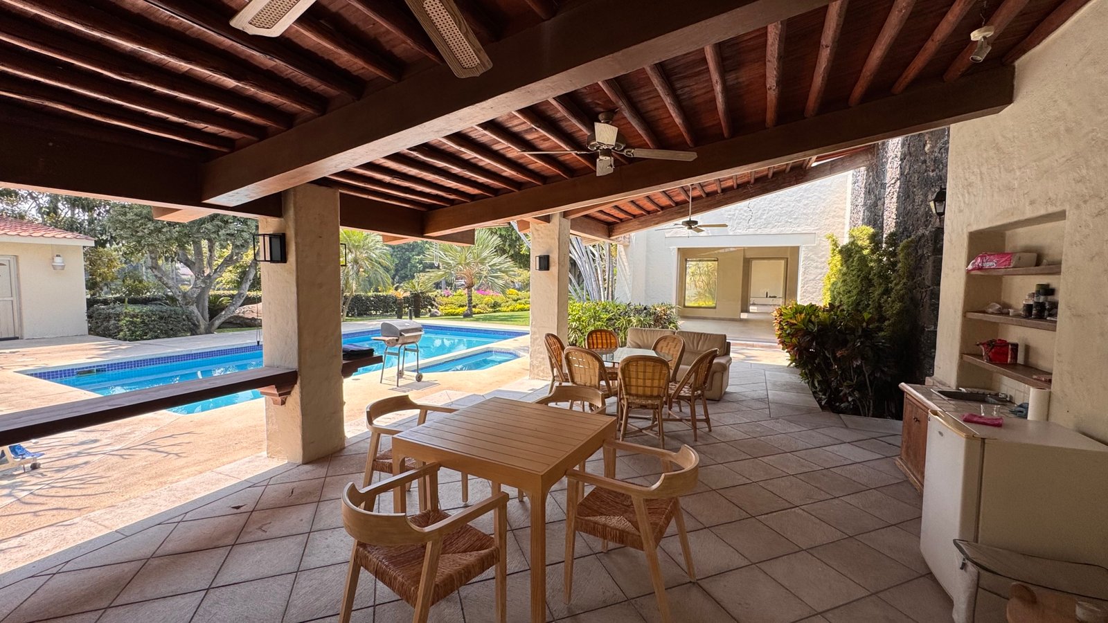 En el exterior destaca una espectacular alberca con asoleadero, rodeada de áreas verdes, terraza y espacio para asador, creando el ambiente perfecto para reuniones y descanso.