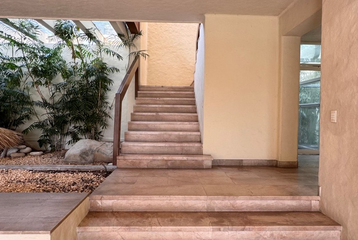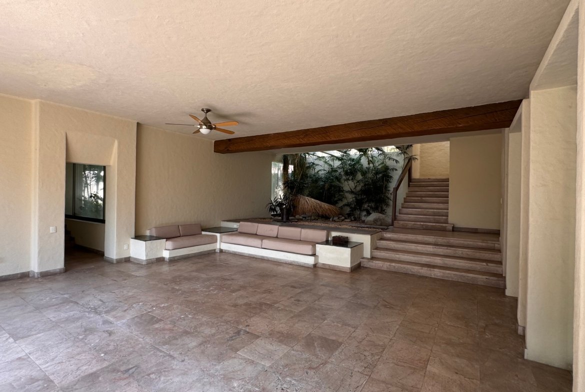 Cuenta con cinco recámaras con vestidor y siete baños, además de dos family rooms que permiten diferentes ambientes de convivencia. Las áreas sociales integran sala y comedor con conexión directa al exterior, generando una excelente relación con el jardín.