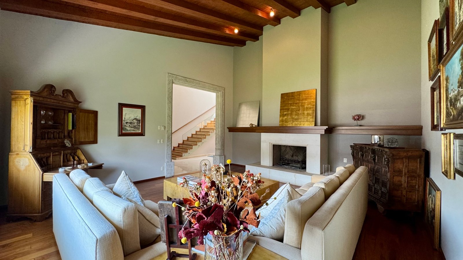 Construida sobre un terreno de 596 m² y con 800 m² de construcción, la casa se distingue por su generosa distribución y sus espacios pensados para la convivencia familiar. La sala principal con chimenea crea un ambiente cálido y acogedor, complementada por el comedor y desayunador que se integran naturalmente al exterior mediante grandes ventanales.