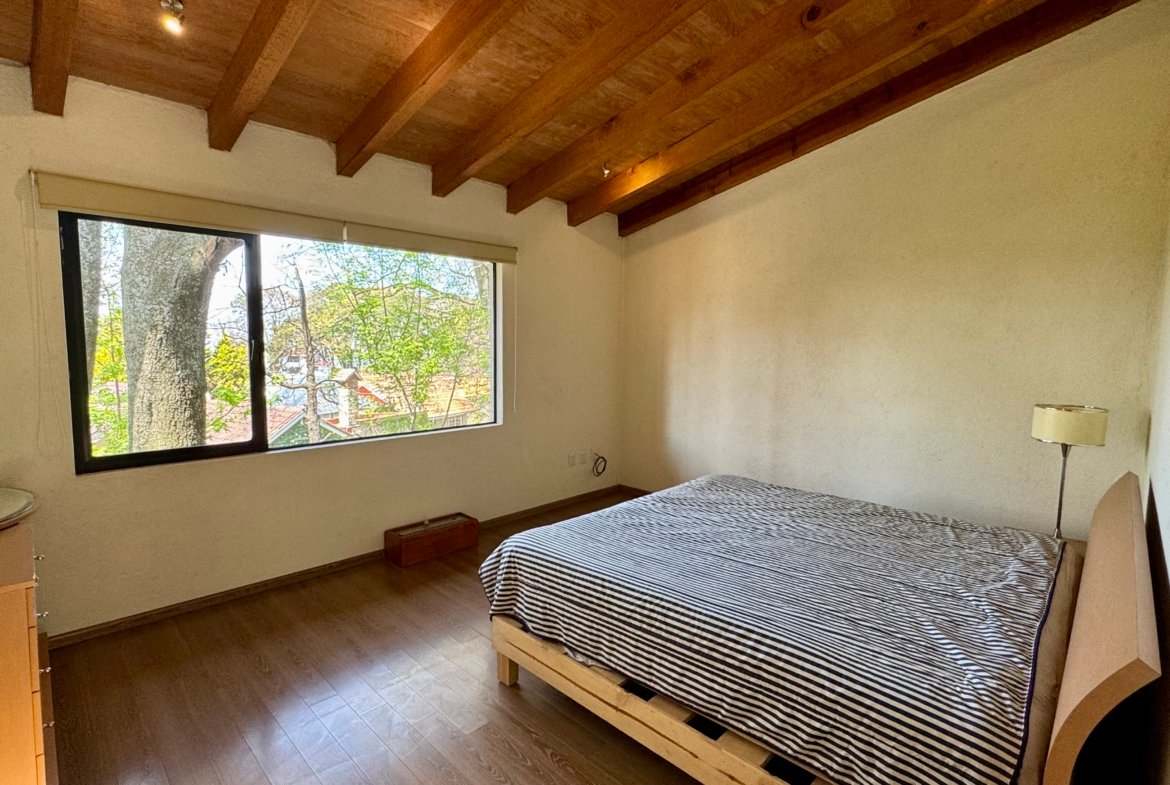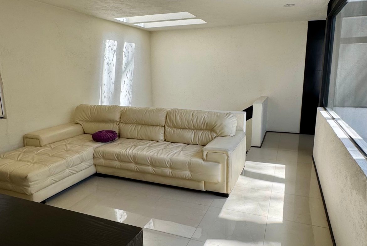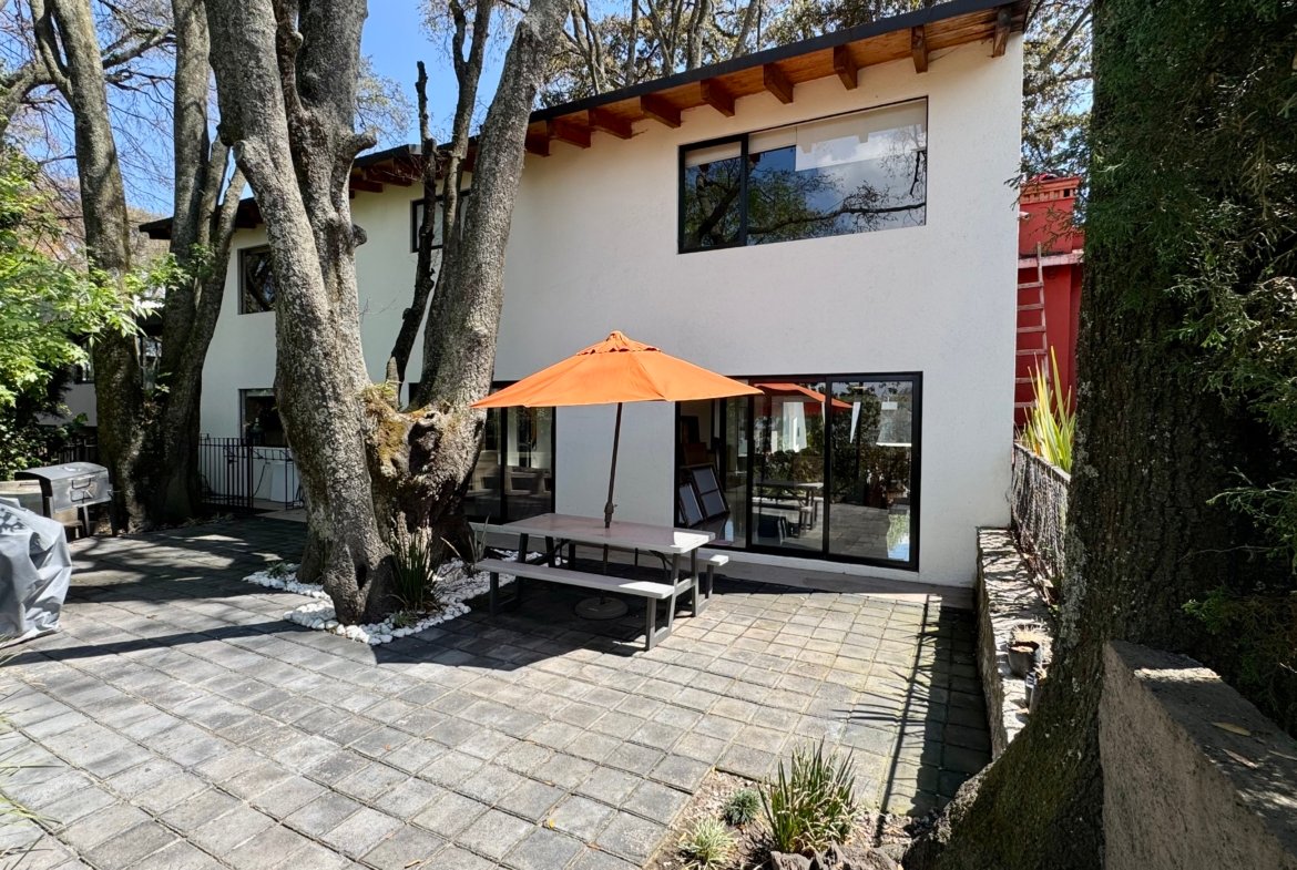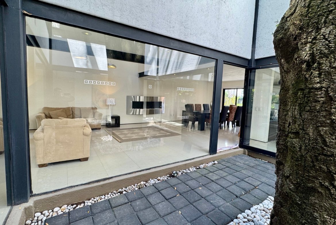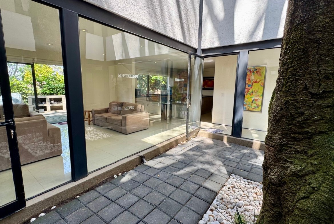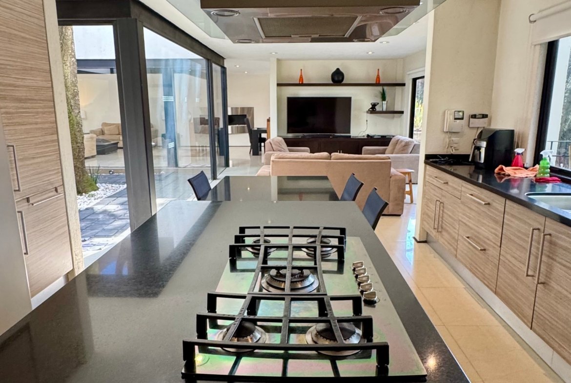 Desarrollada sobre un terreno de 540 m² con 448 m² de construcción, la casa destaca por su diseño contemporáneo y su excelente relación entre interiores y exteriores. La sala y comedor se integran mediante grandes ventanales hacia los patios arbolados, permitiendo que la luz natural y las vistas verdes acompañen cada espacio.