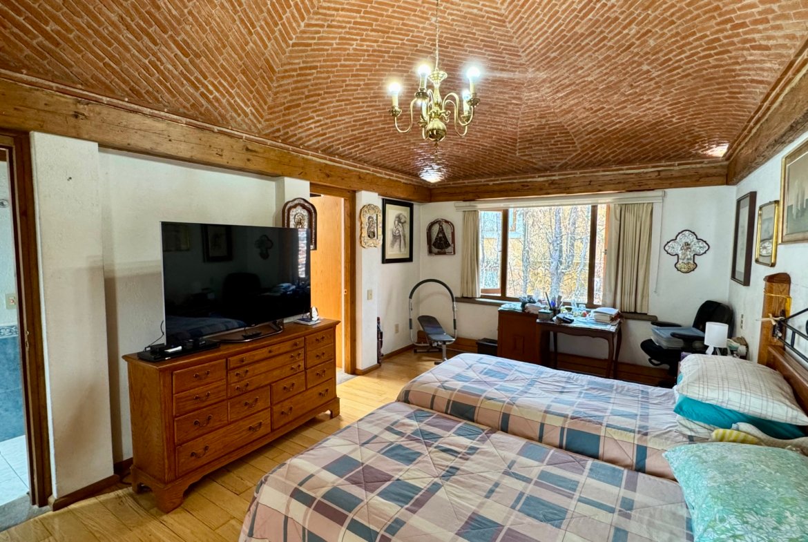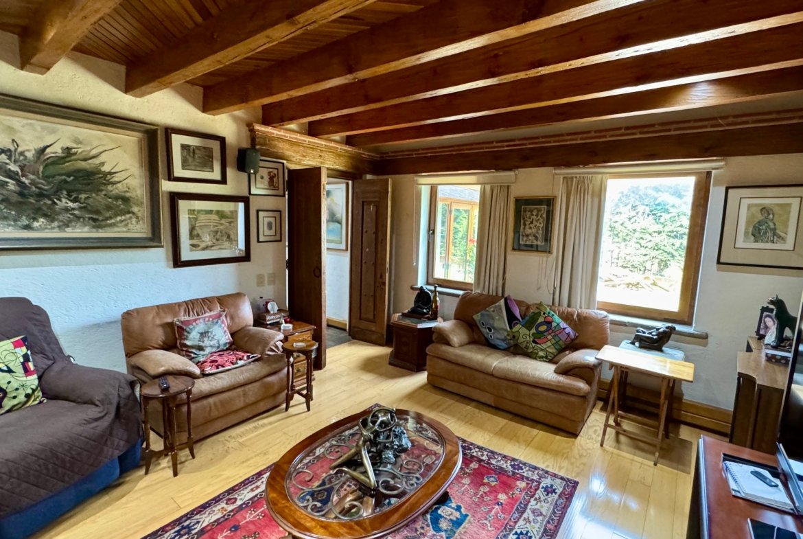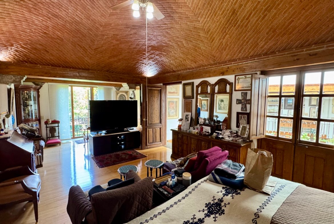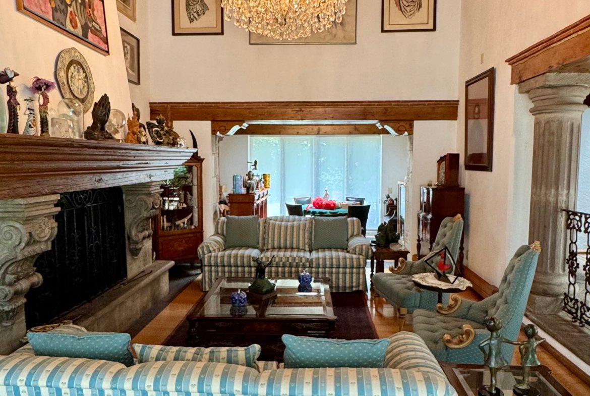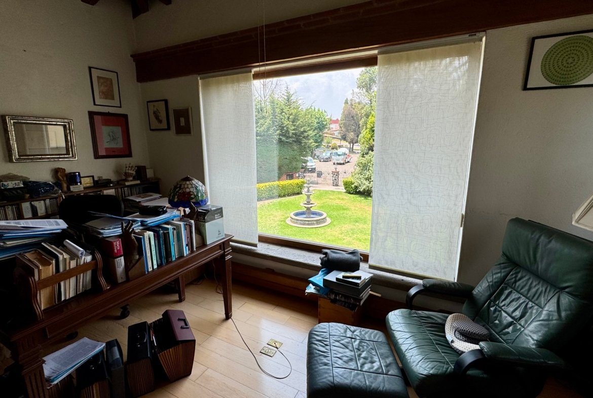 Al ingresar, los espacios transmiten elegancia y tradición: una amplia sala con chimenea y doble altura, comedor con área de desayuno y múltiples zonas de convivencia que permiten reuniones formales o familiares con total comodidad. El estudio y biblioteca crean un ambiente único, ideal para lectura, trabajo o contemplación, aportando personalidad y carácter a la casa.