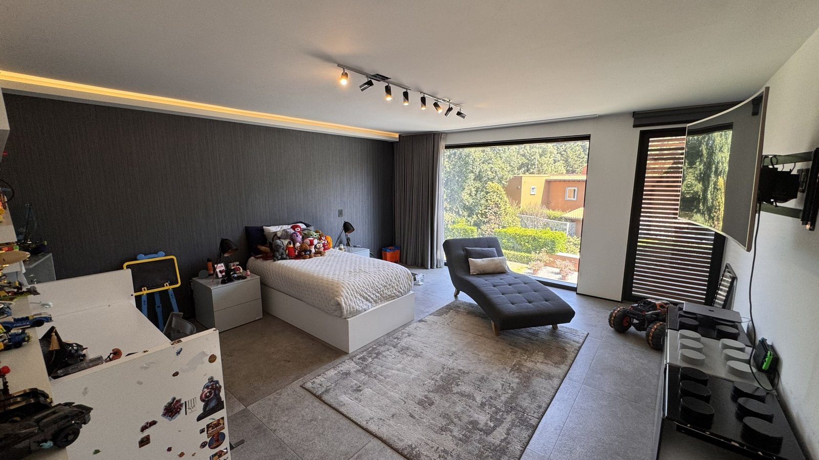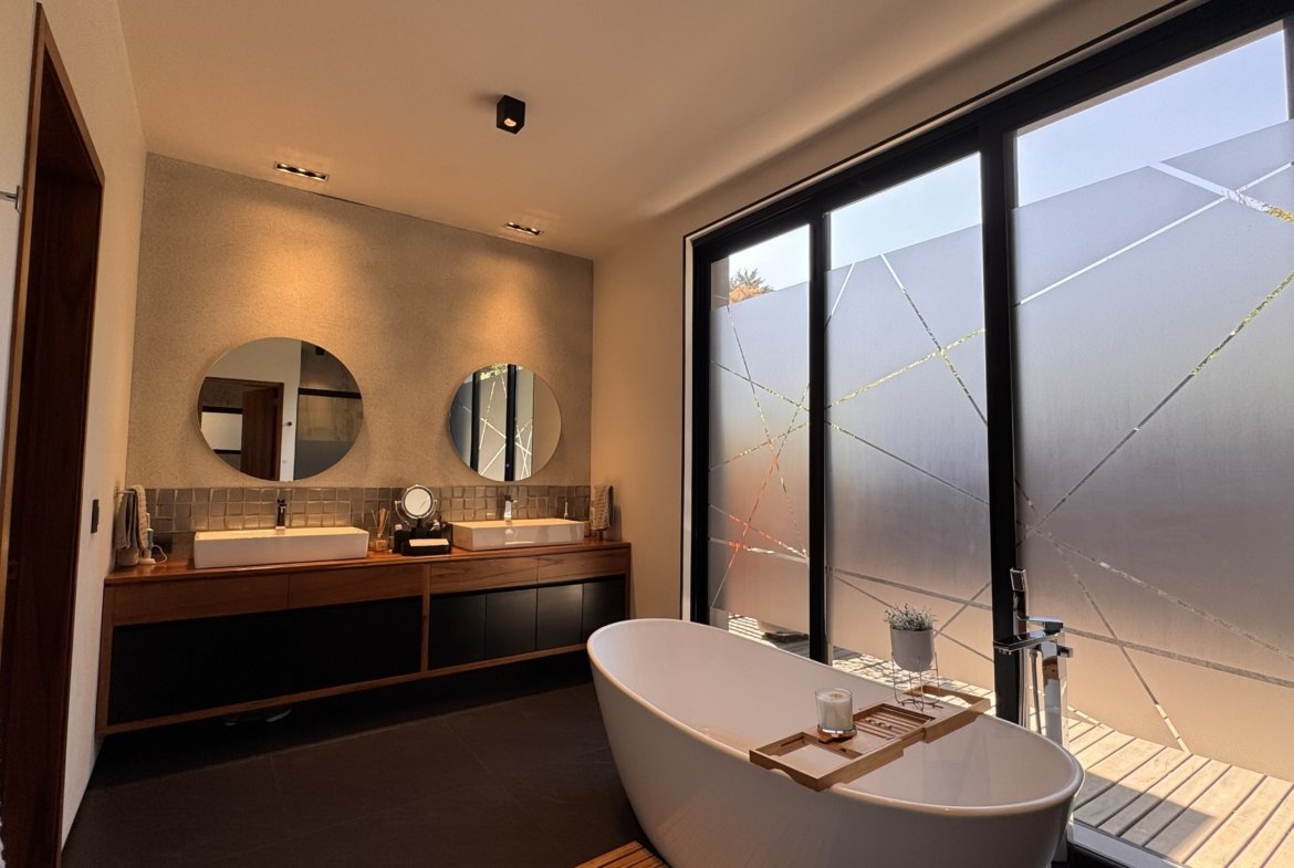 La propiedad se desarrolla sobre un terreno de 1,150 m² con 650 m² de construcción, destacando por su arquitectura sólida y materiales premium en cada espacio. Cuenta con cuatro amplias recámaras, cuatro baños completos y dos medios baños, diseñados para ofrecer comodidad y funcionalidad.