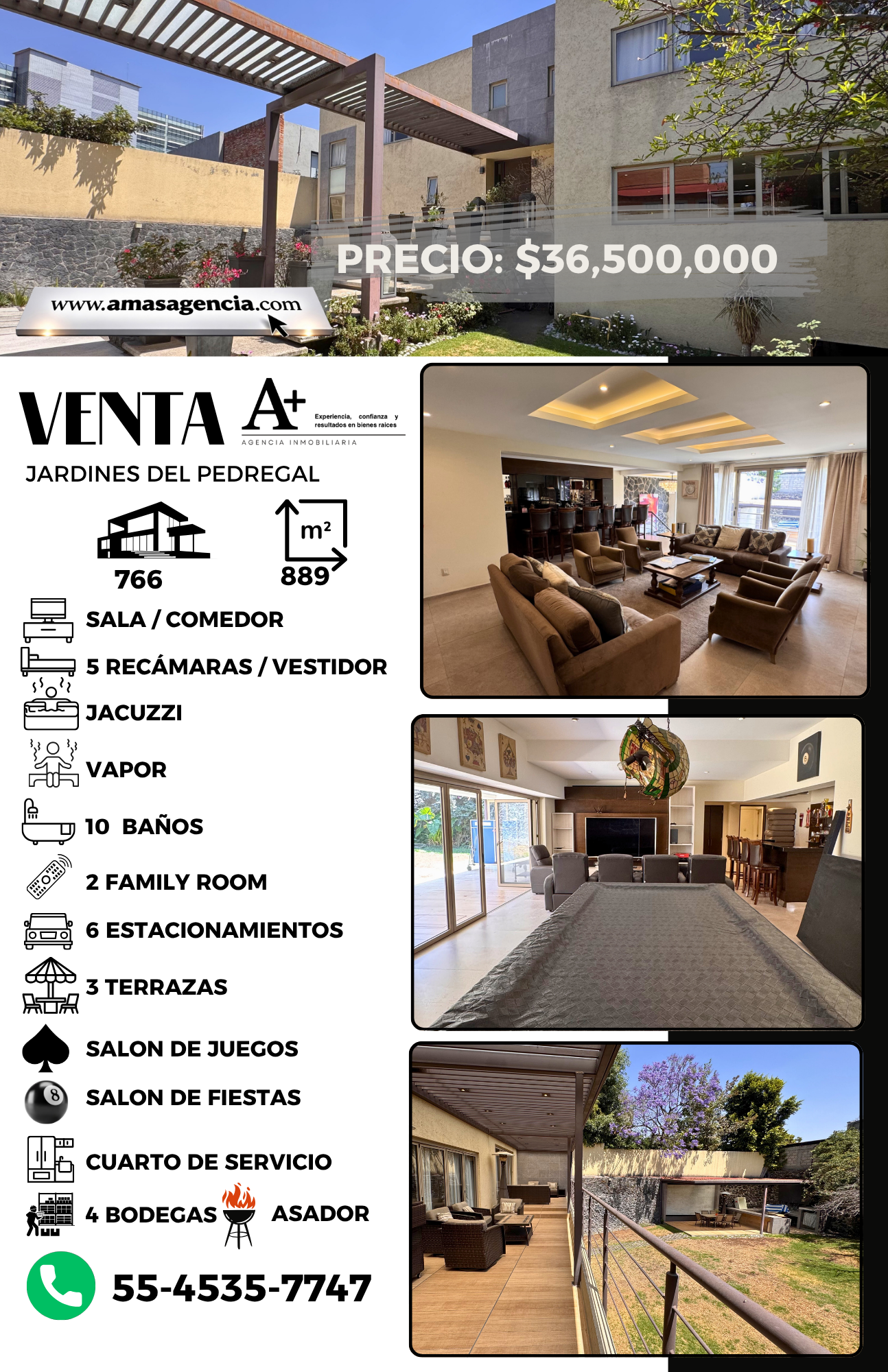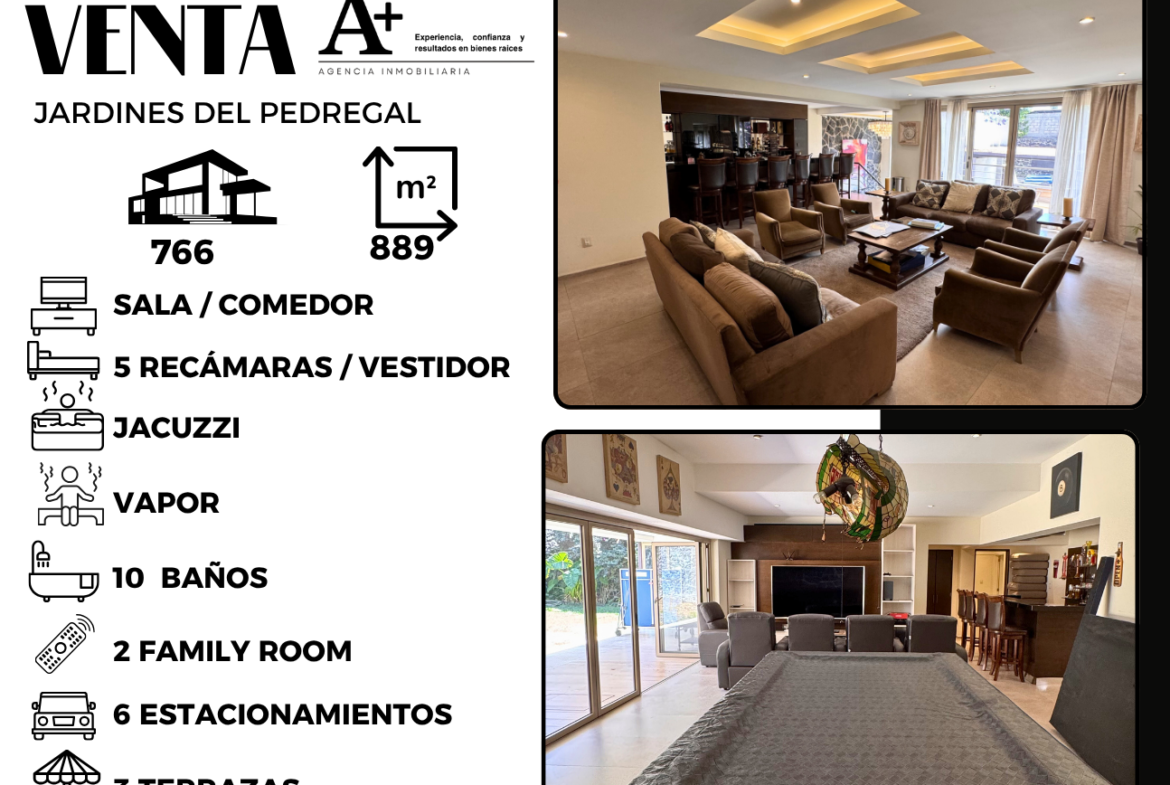 La propiedad se desarrolla sobre un terreno de 889 m² con 766 m² de construcción, ofreciendo espacios amplios y una distribución ideal para disfrutar tanto la vida diaria como el entretenimiento.