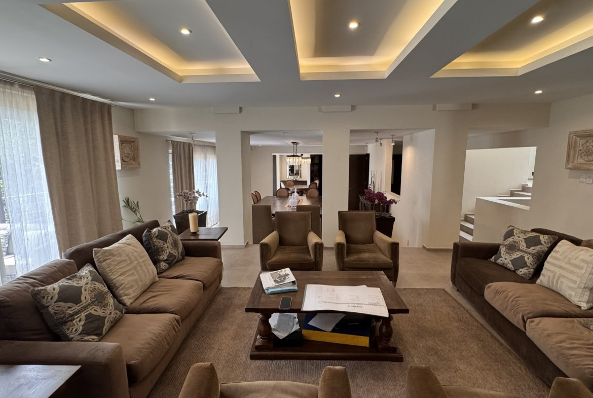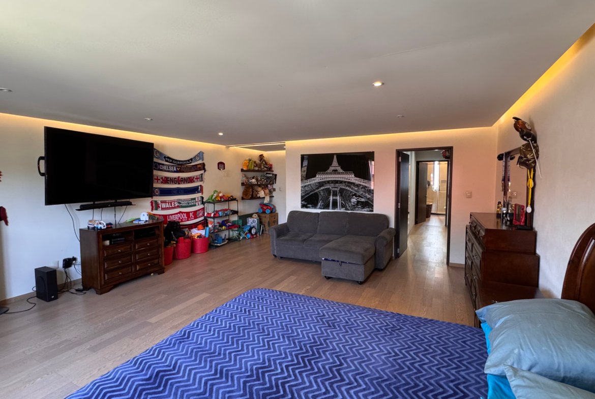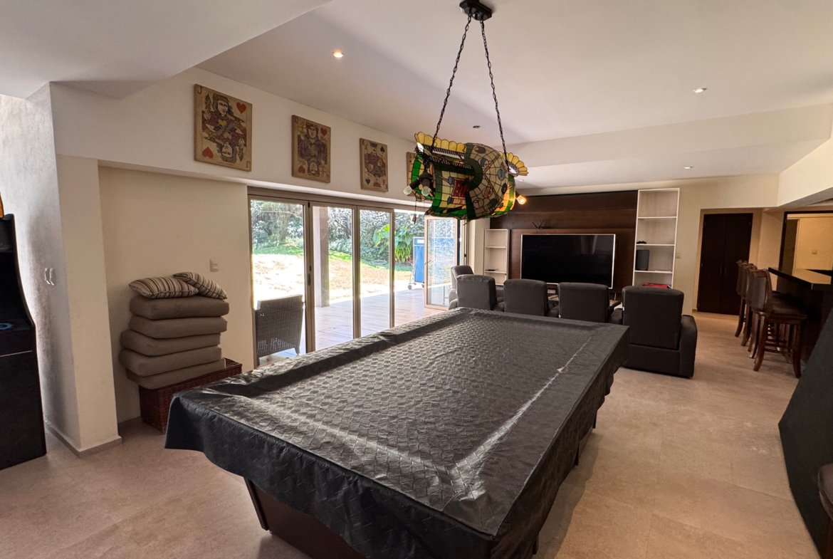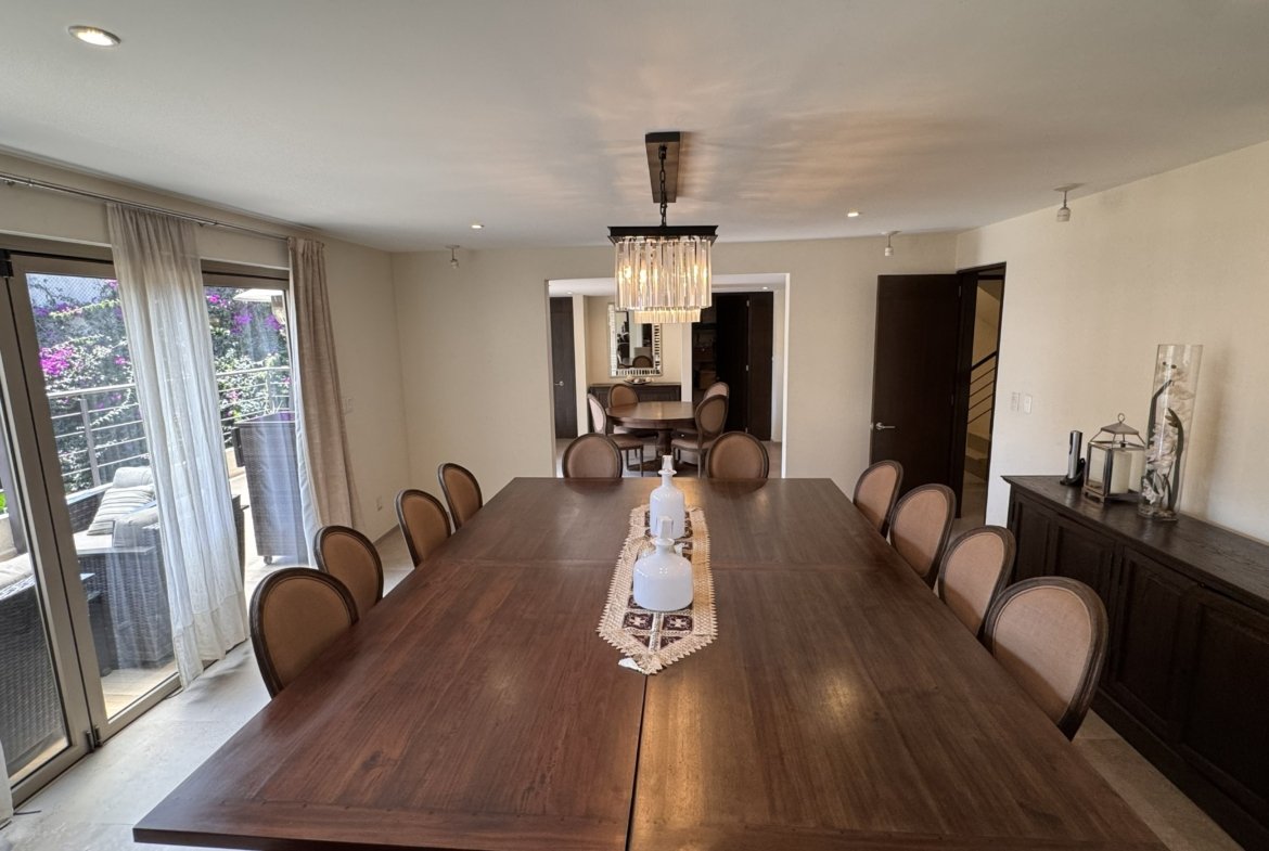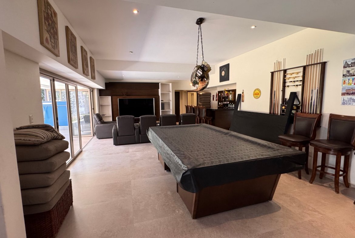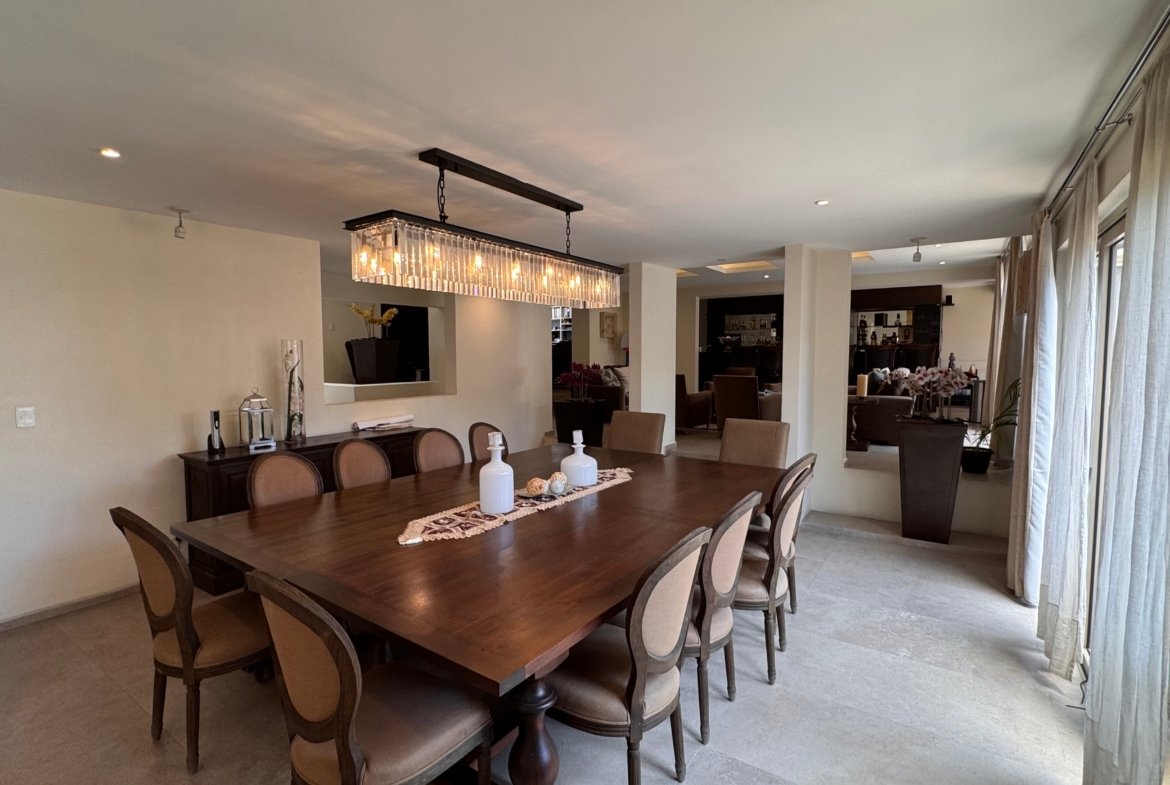 Cuenta con cinco recámaras con vestidor y diez baños, además de dos family rooms que permiten crear distintos ambientes de convivencia. Las áreas sociales integran sala y comedor con gran amplitud, conectando con terrazas y el jardín.