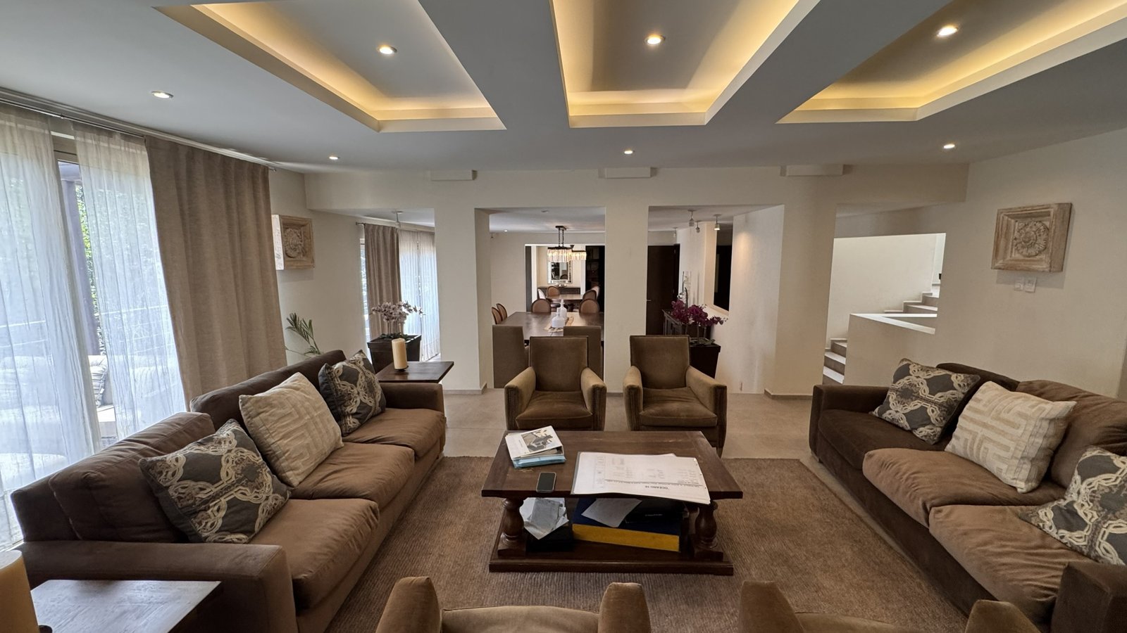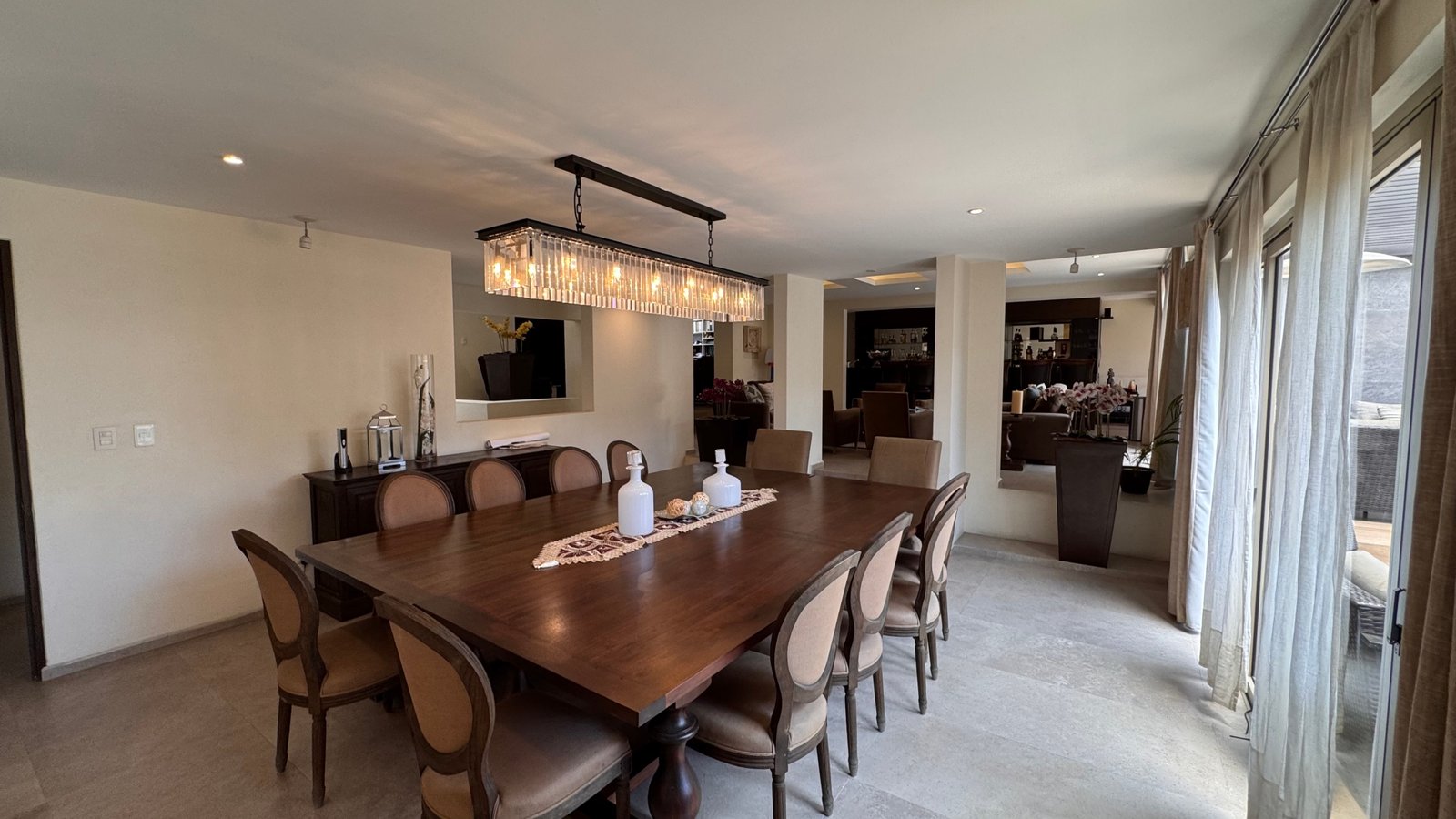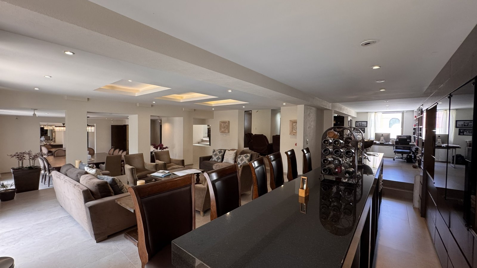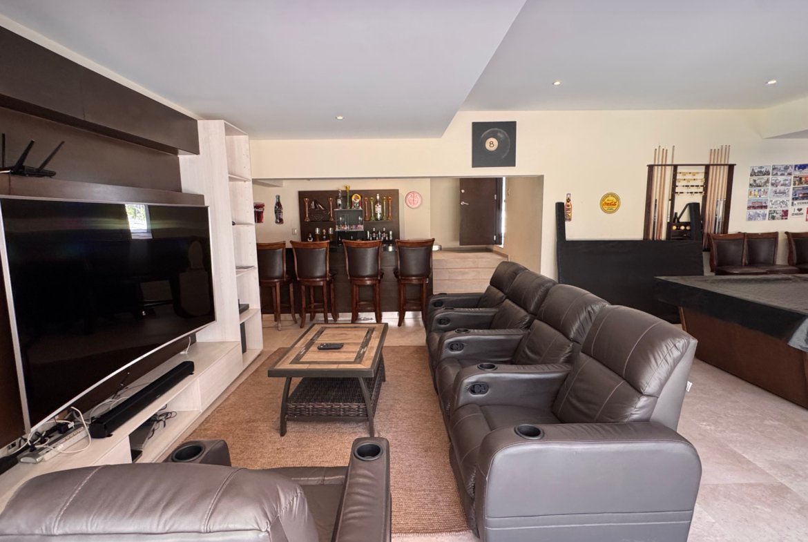 Cuenta con cinco recámaras con vestidor y diez baños, además de dos family rooms que permiten crear distintos ambientes de convivencia. Las áreas sociales integran sala y comedor con gran amplitud, conectando con terrazas y el jardín.