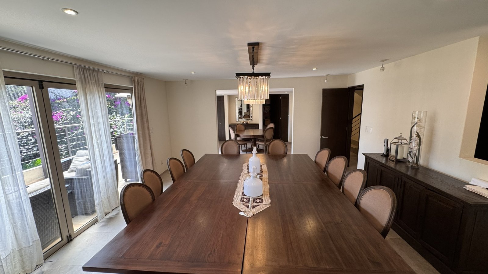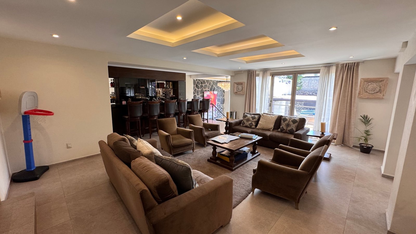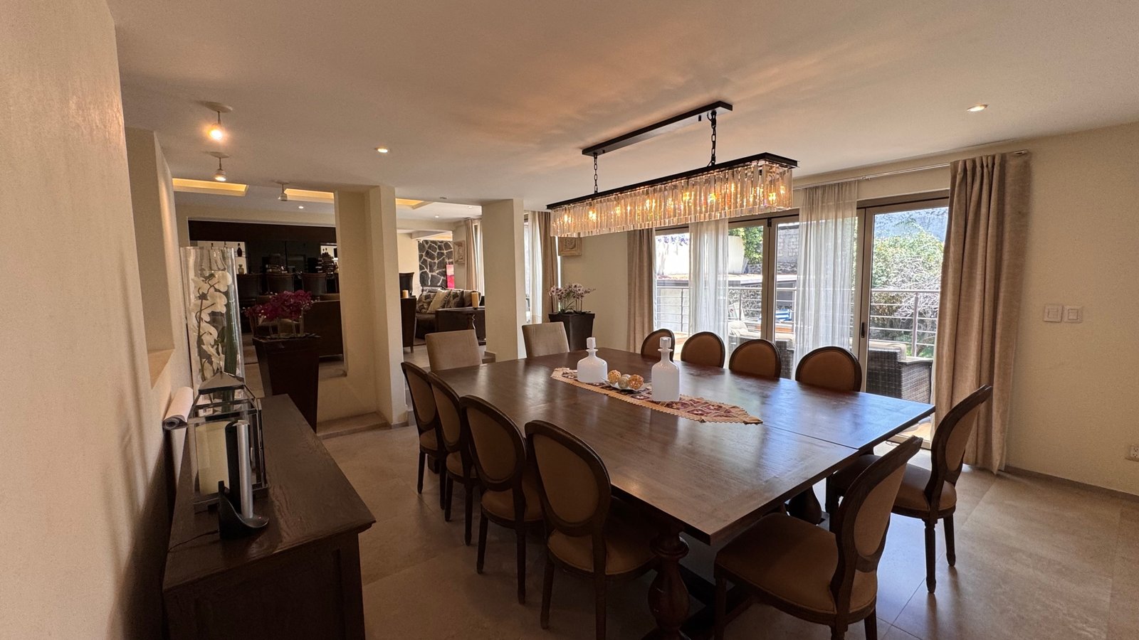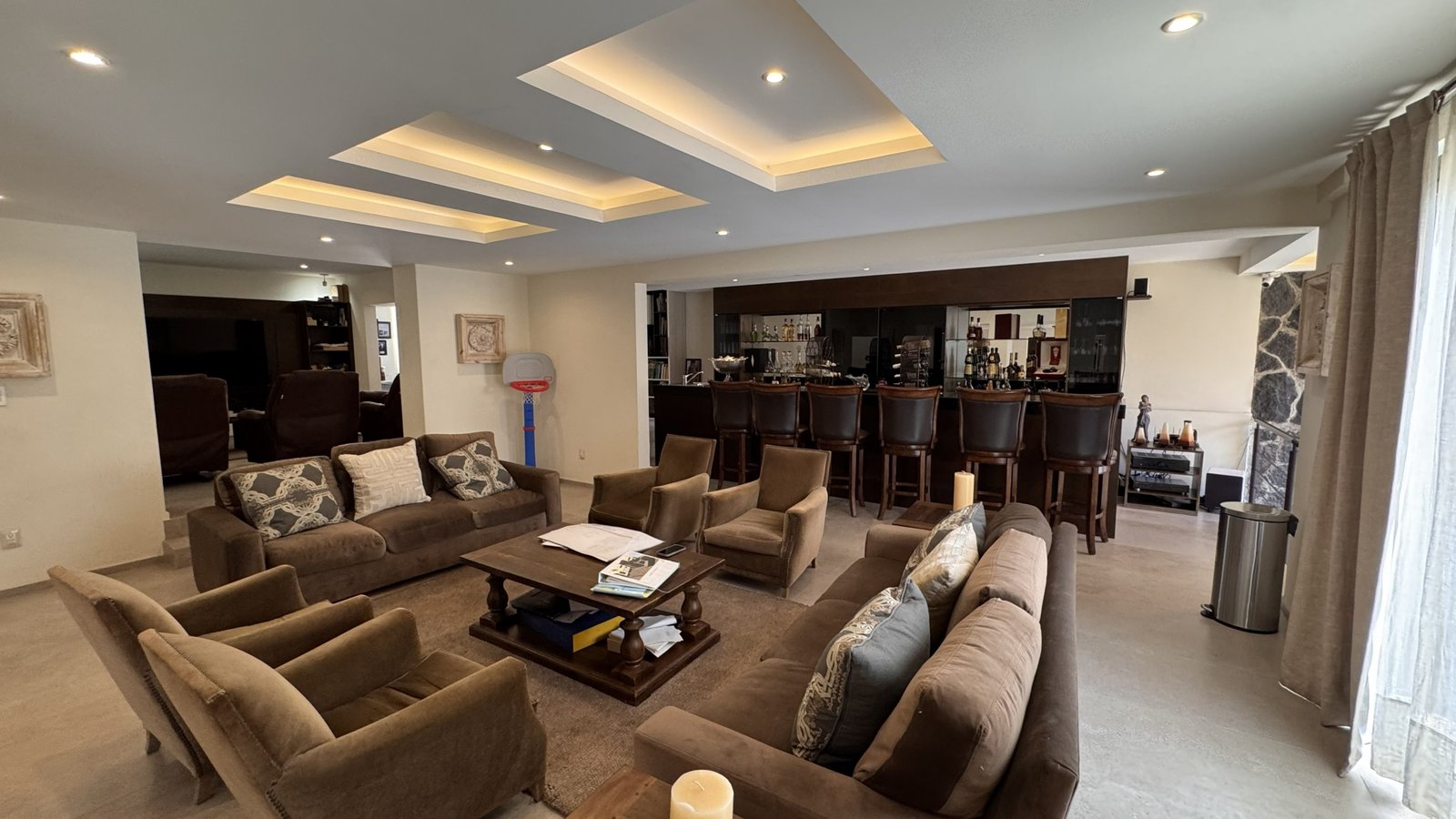Cuenta con cinco recámaras con vestidor y diez baños, además de dos family rooms que permiten crear distintos ambientes de convivencia. Las áreas sociales integran sala y comedor con gran amplitud, conectando con terrazas y el jardín.