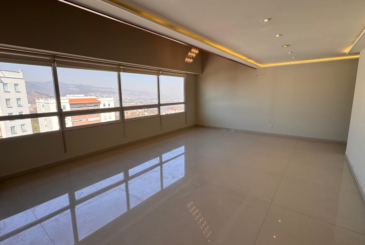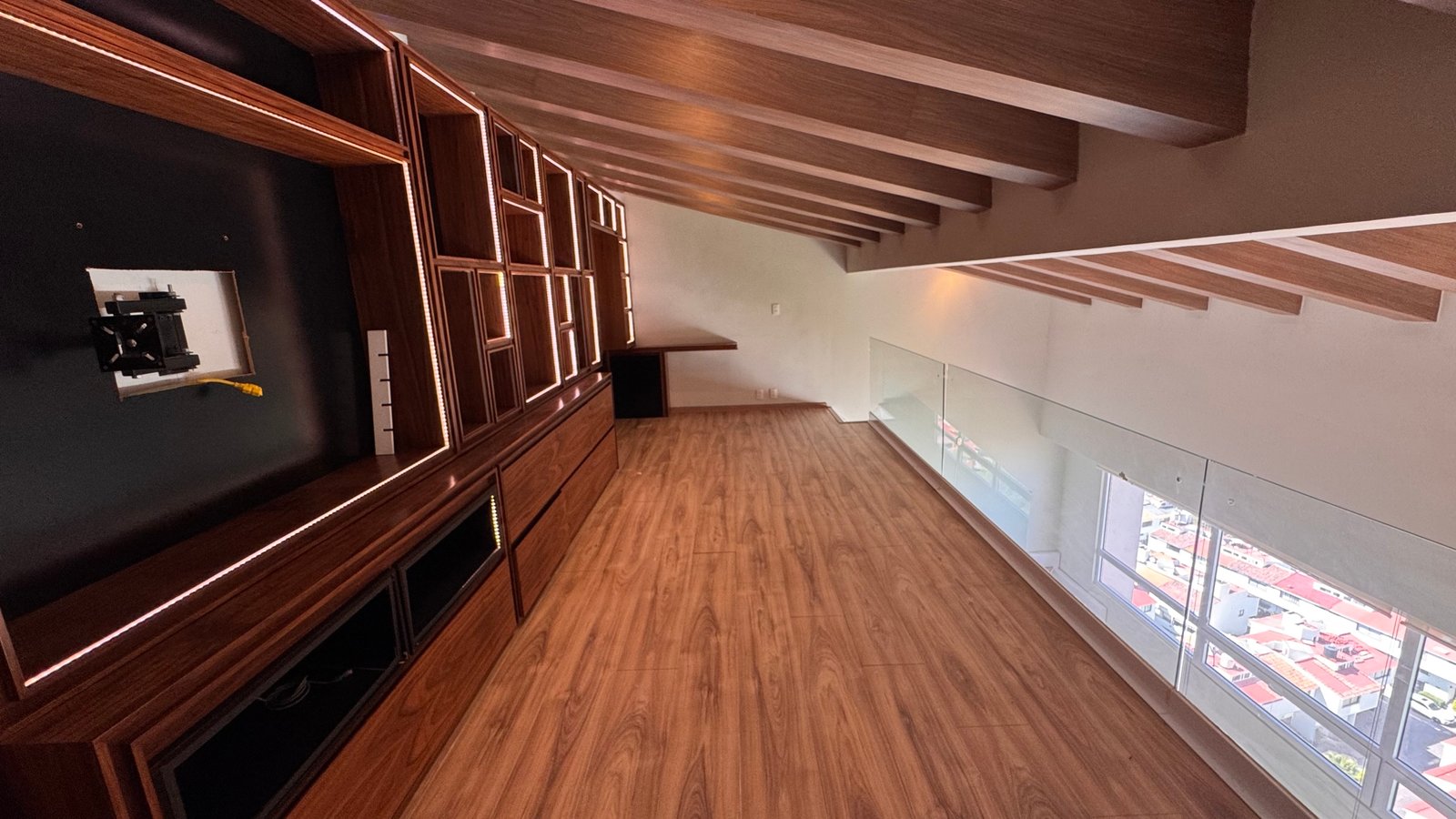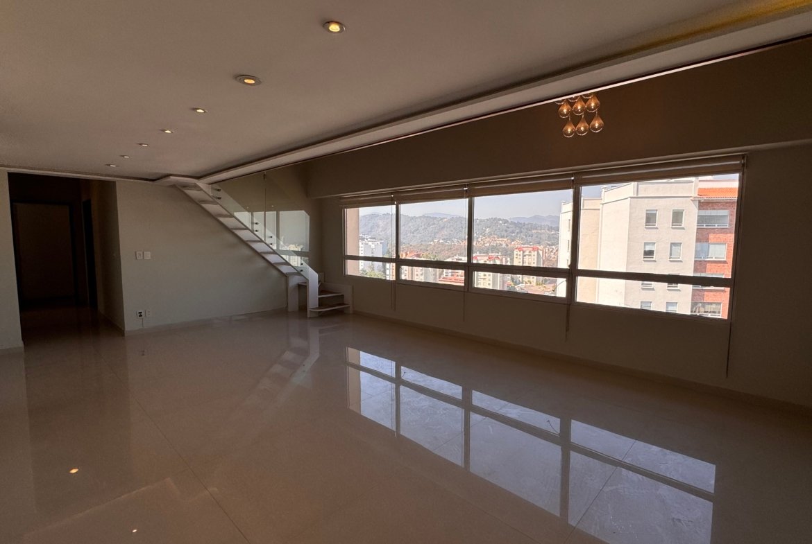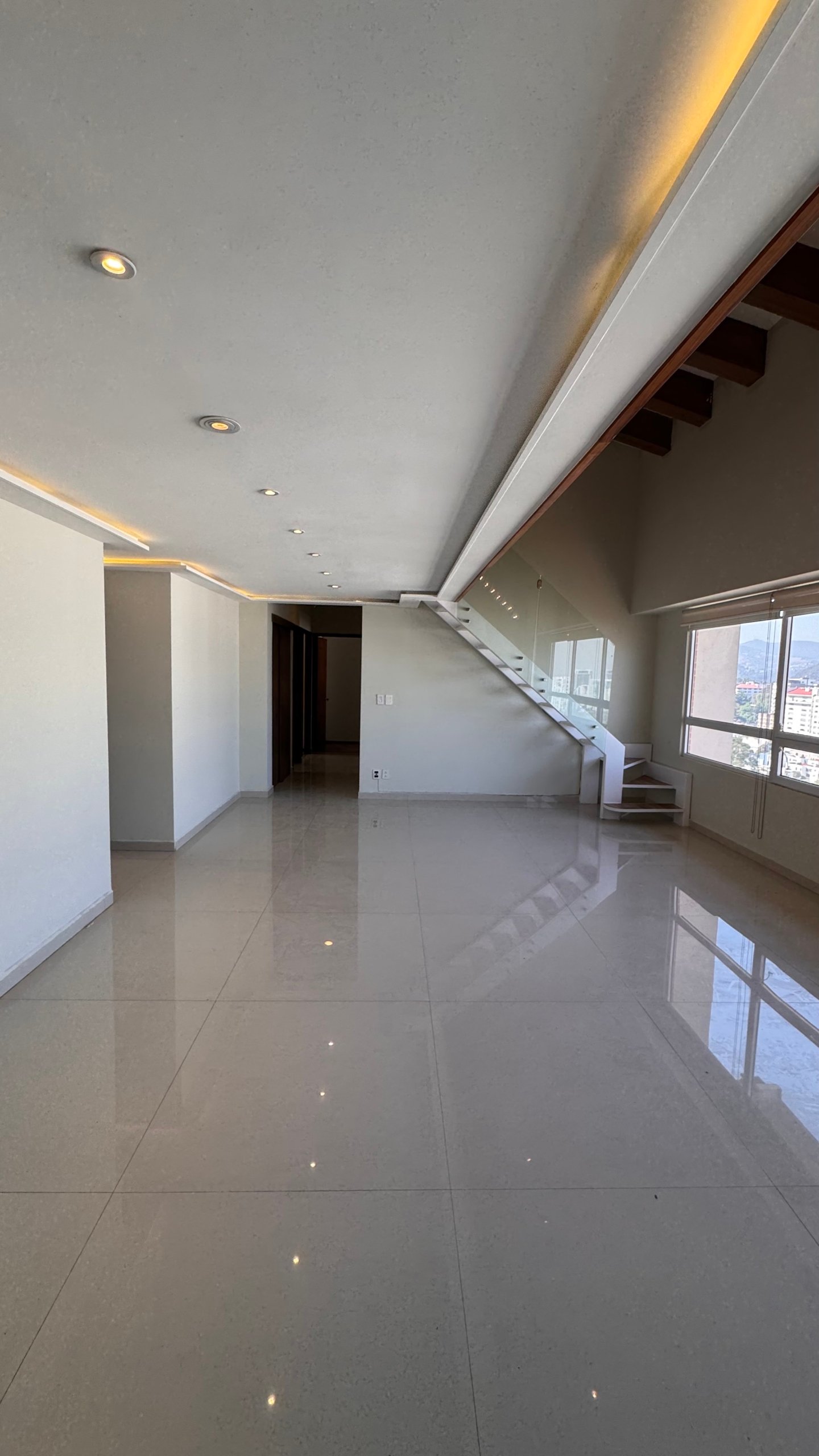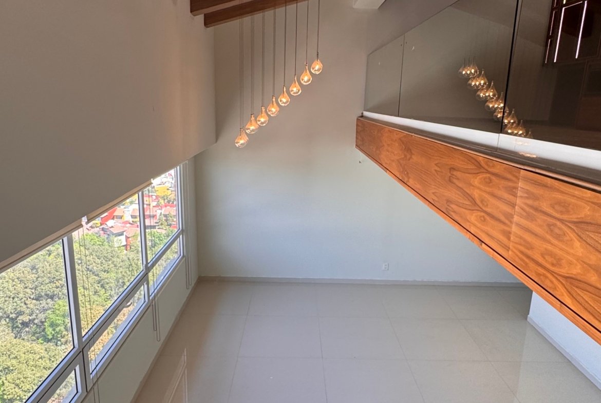 Departamento con espacios amplios y doble altura que aportan luz y sensación de libertad. La estancia integra sala y comedor de forma elegante, mientras la cocina contemporánea ofrece funcionalidad para el día a día.